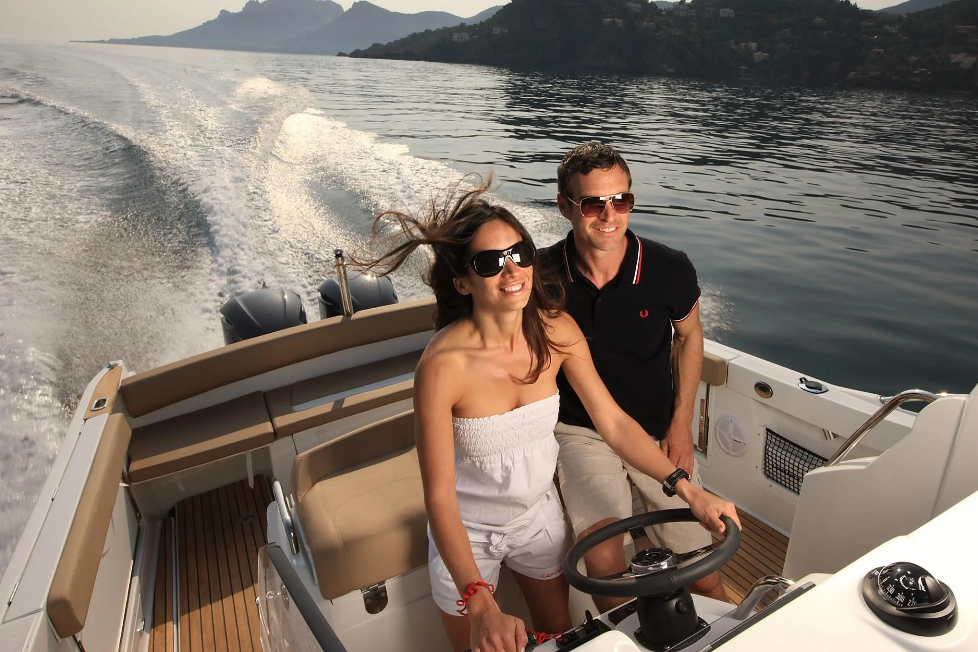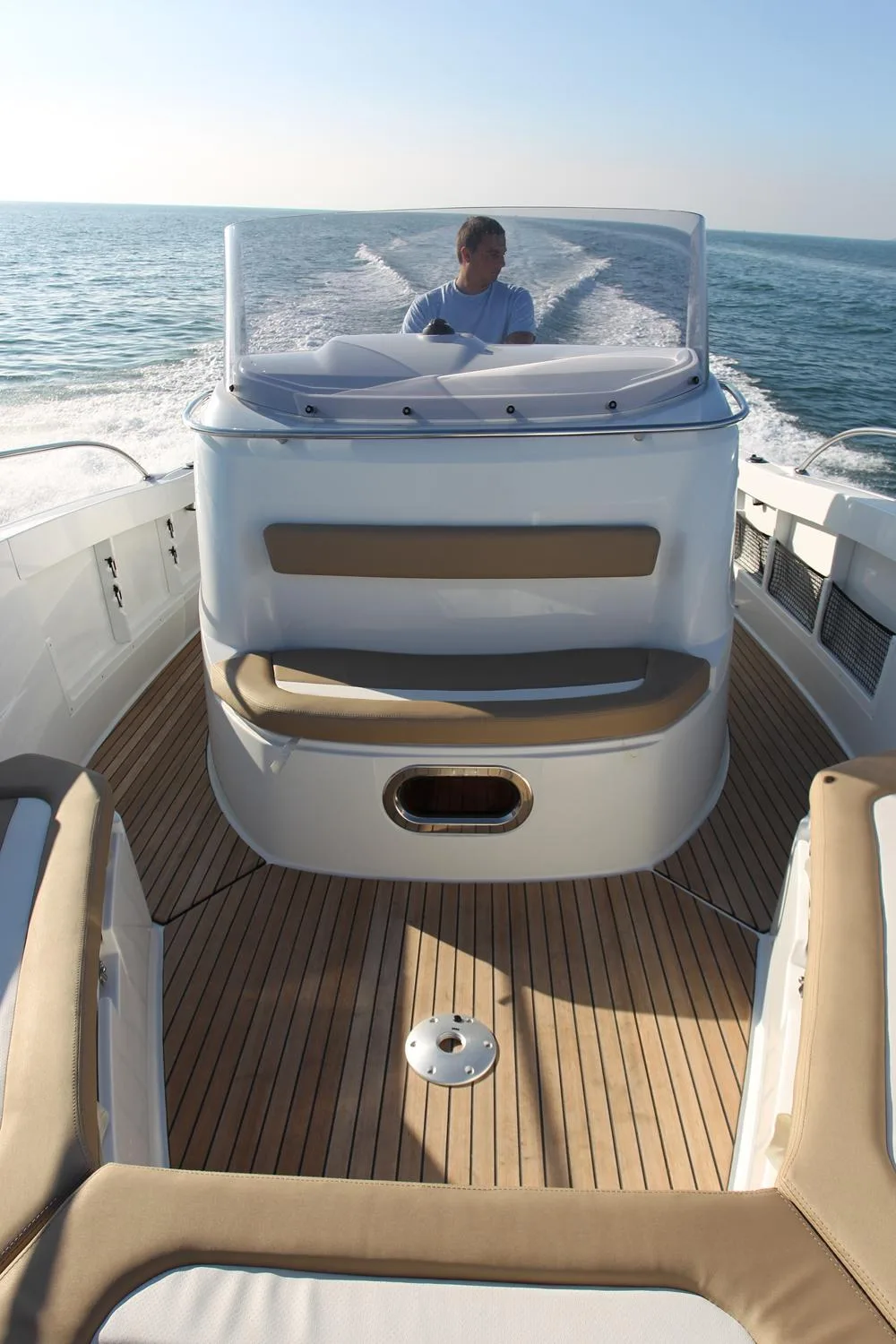 Cuadro de mandos electrónico, volante forrado en piel, suelo de teca, cómodo y muy seguro para desplazarse de proa a popa.