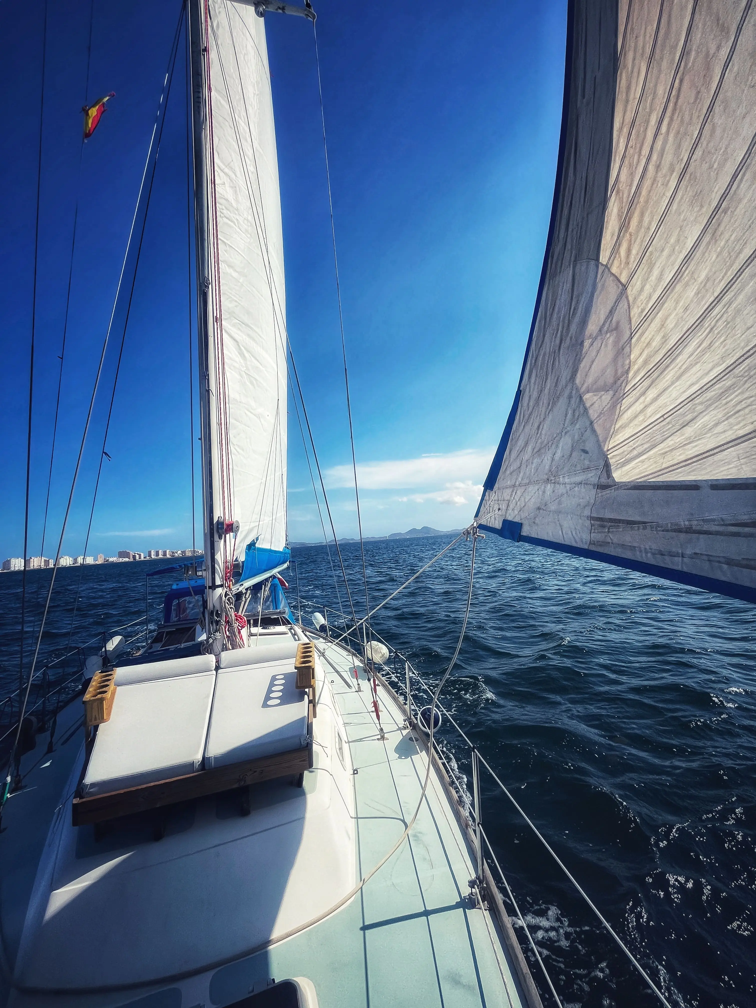Bimini, capota, plataforma con ducha de agua dulce en popa, amplio solárium en proa con colchonetas, tabla de paddle surf, equipo de snorkel, colchonetas en cockpit, nevera exterior para tus bebidas y otra en el interior.