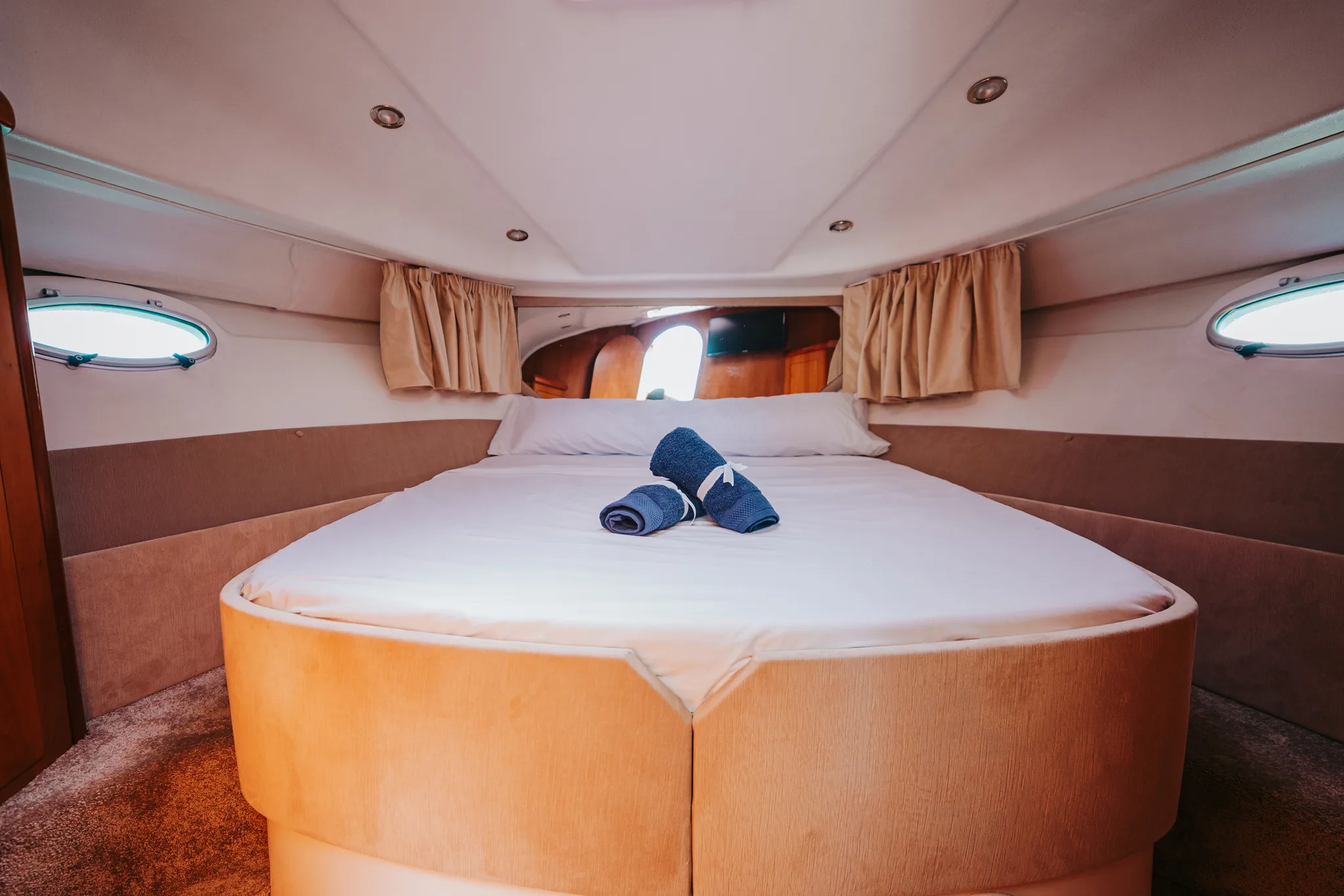 Dos camarotes con cama doble y armarios a ambas bandas y una cabina de aseo provista de todos los elementos necesarios.